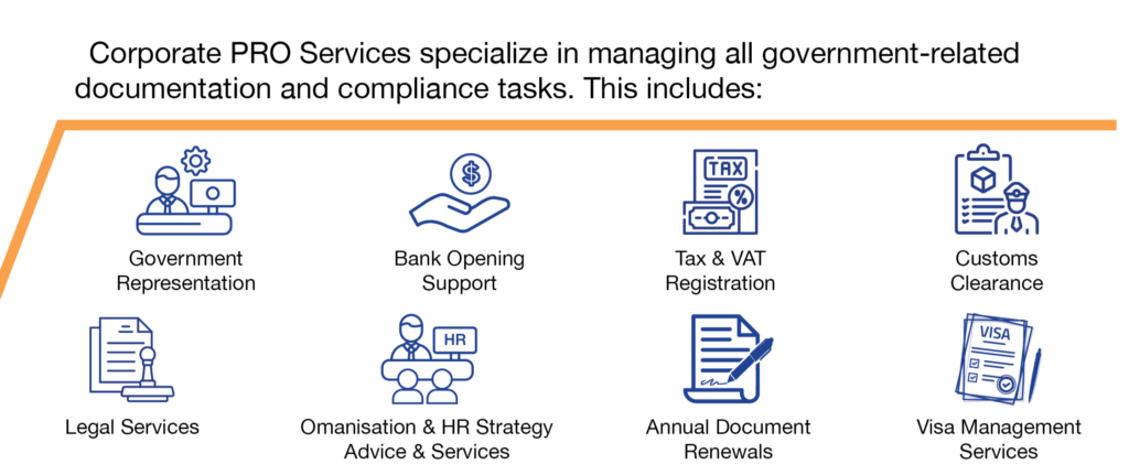 There is a clear trend that new and established companies are benefitting from outsourcing the back office and corporate PRO services. It saves them significant management time, allows them to focus on growing the business, cost savings and most importantly a broad range of services such as government representation, bank opening, tax & VAT registration, visa management, customs clearance, Omanisation strategy & HR support, legal services, and annual company document renewals. Click here to know more.