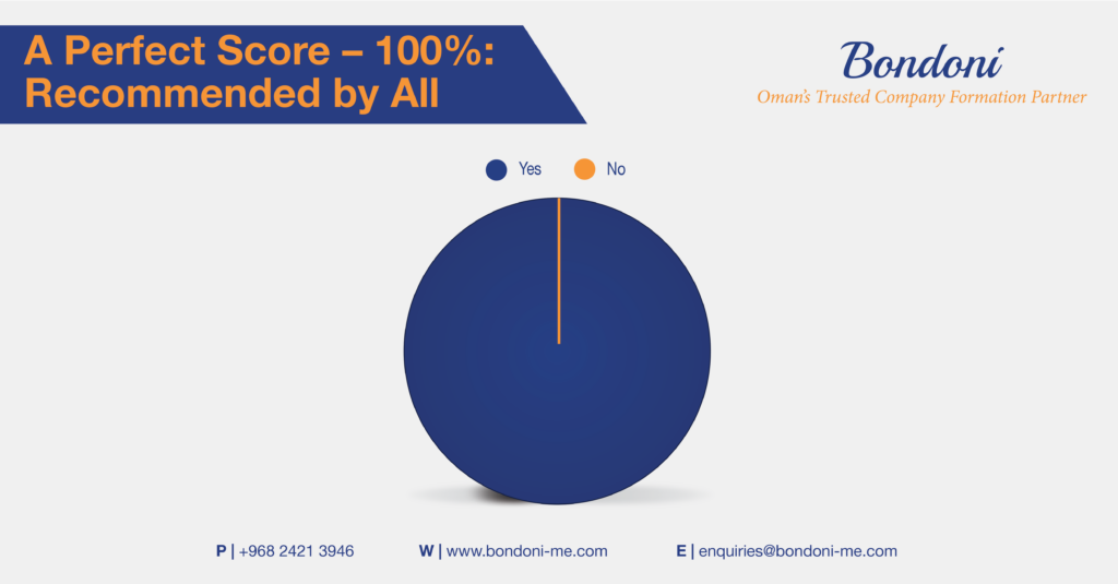 What sets Bondoni apart? Our clients and partners have spoken. From our client feedback survey, the results are clear—our clients and partners 100% recommends Bondoni to others. A perfect score reinforcing Bondoni’s position as a trusted business support and corporate services partner in Oman. This reflects the trust placed in our expertise, responsiveness, and commitment to our clients and partners.